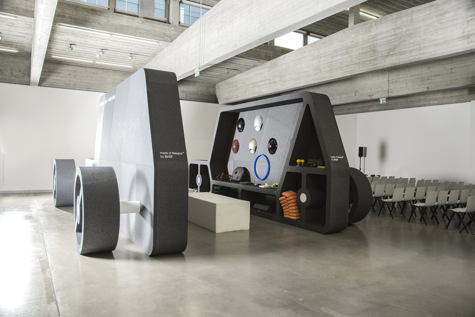 Die Neopor®-Installation auf dem „fabriktag“ der BASF enthält Exponate rund ums Fahren und Wohnen.